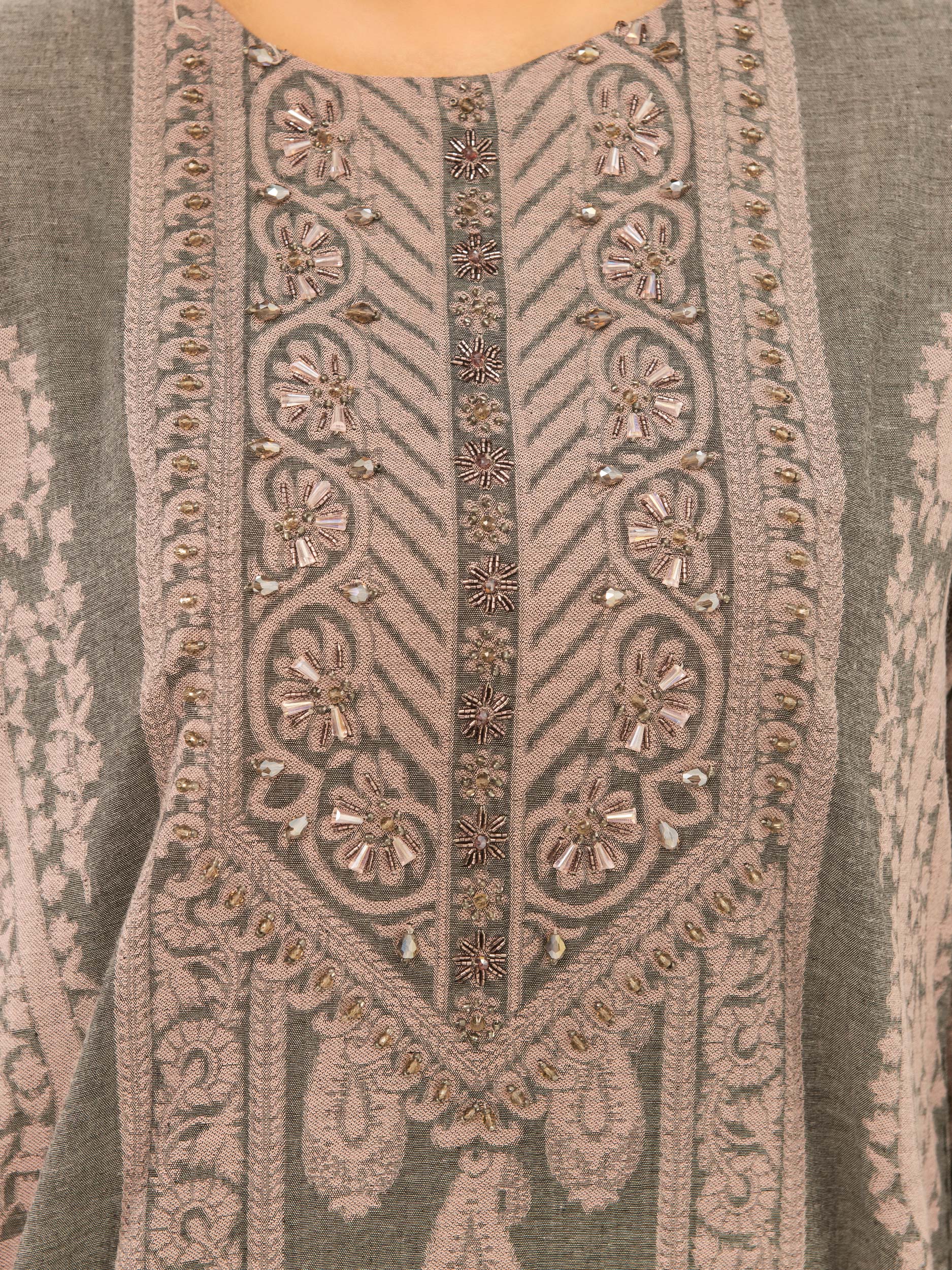 - Crystal, bugle and metallic beads on the placket