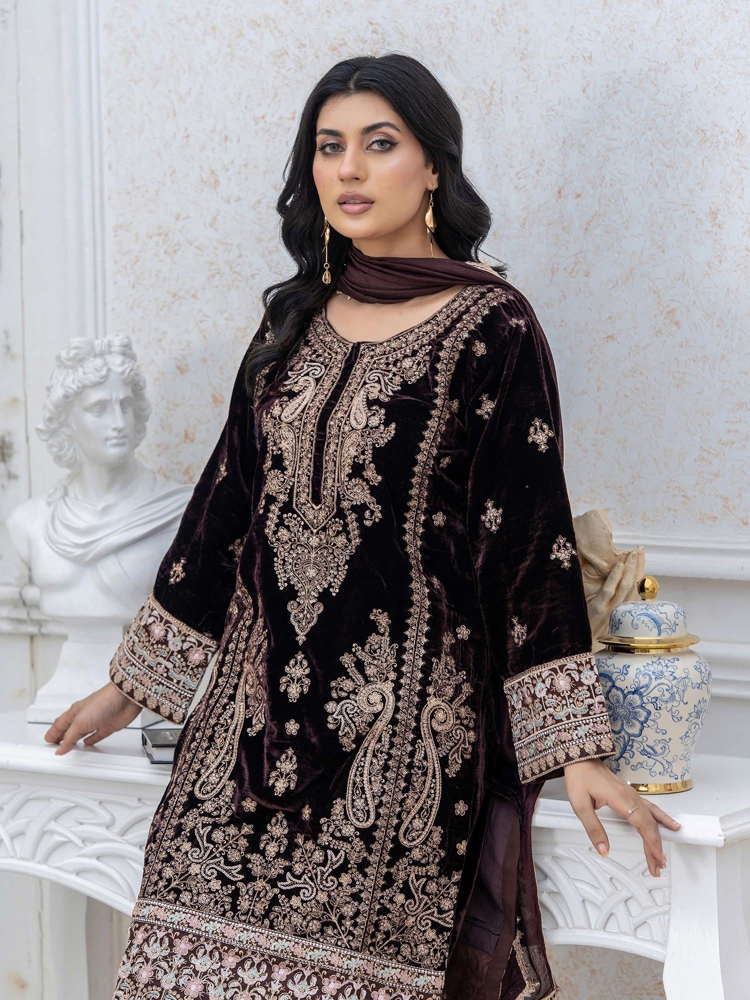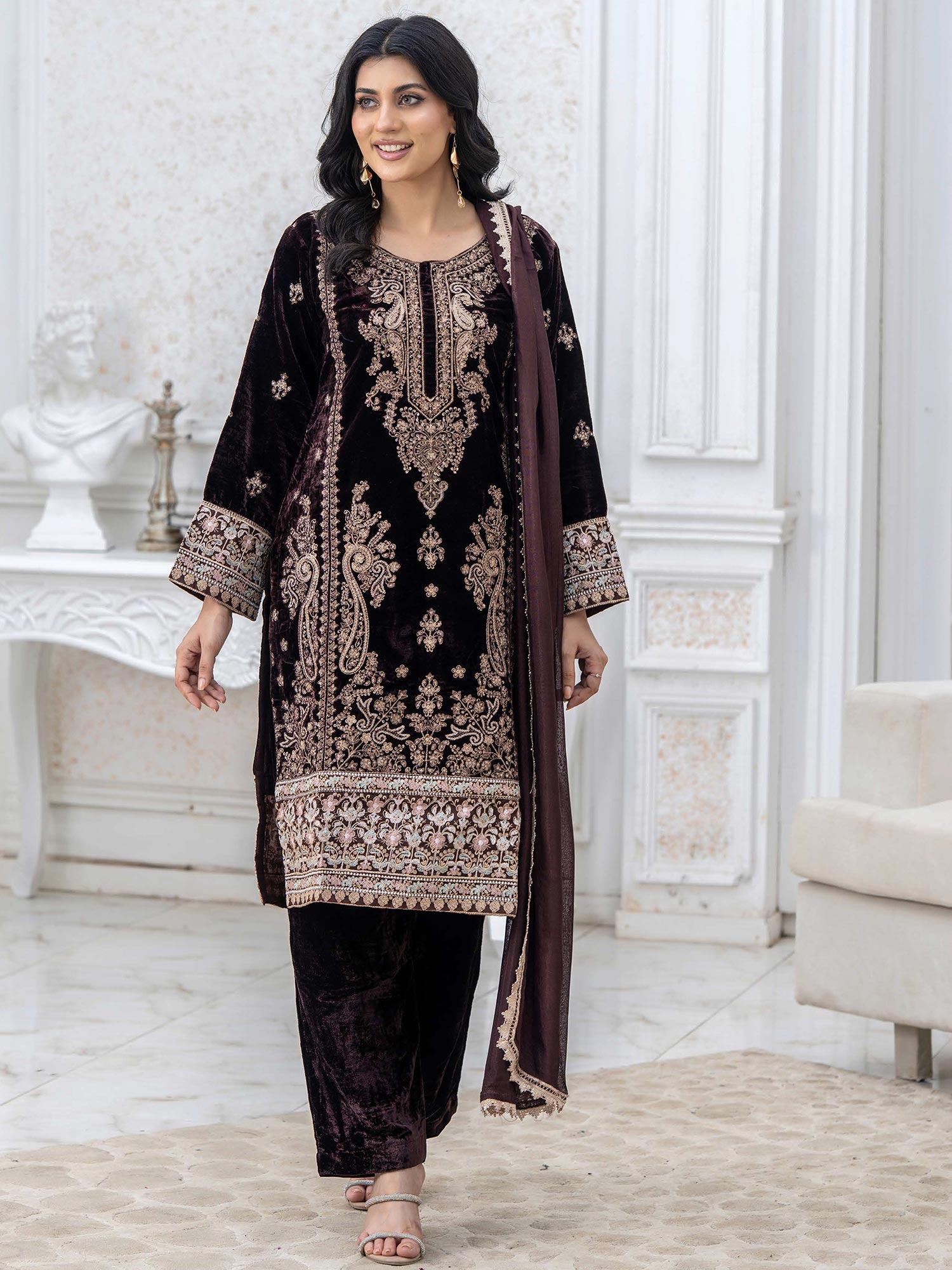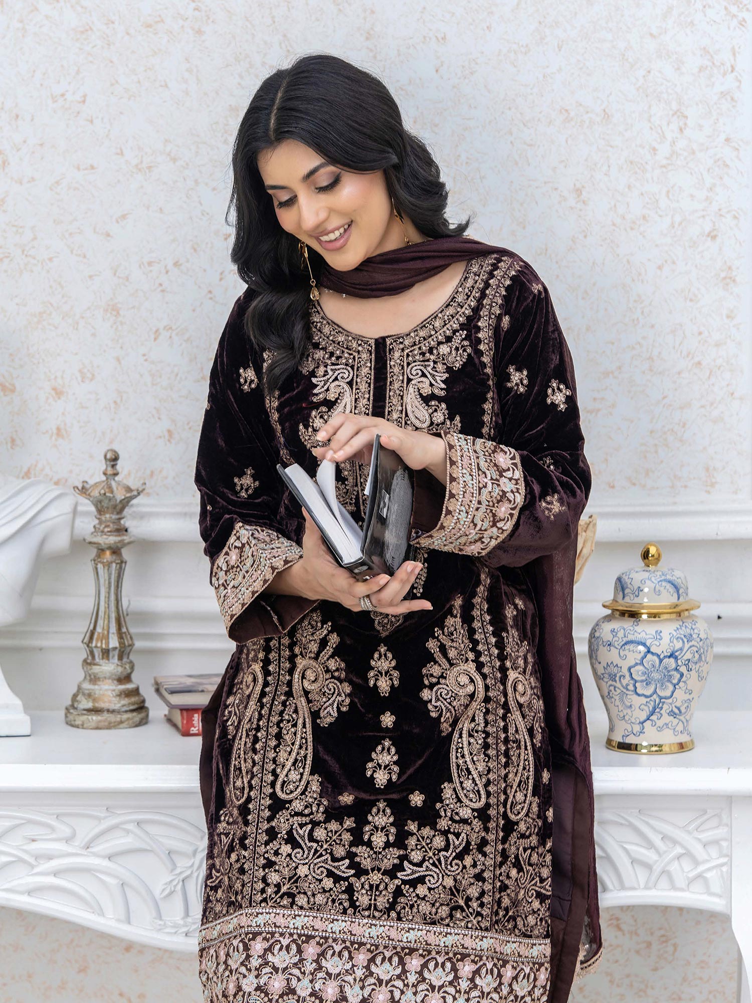 Rangz Lux Velvet Embroidered 3-Piece Suit - Brown