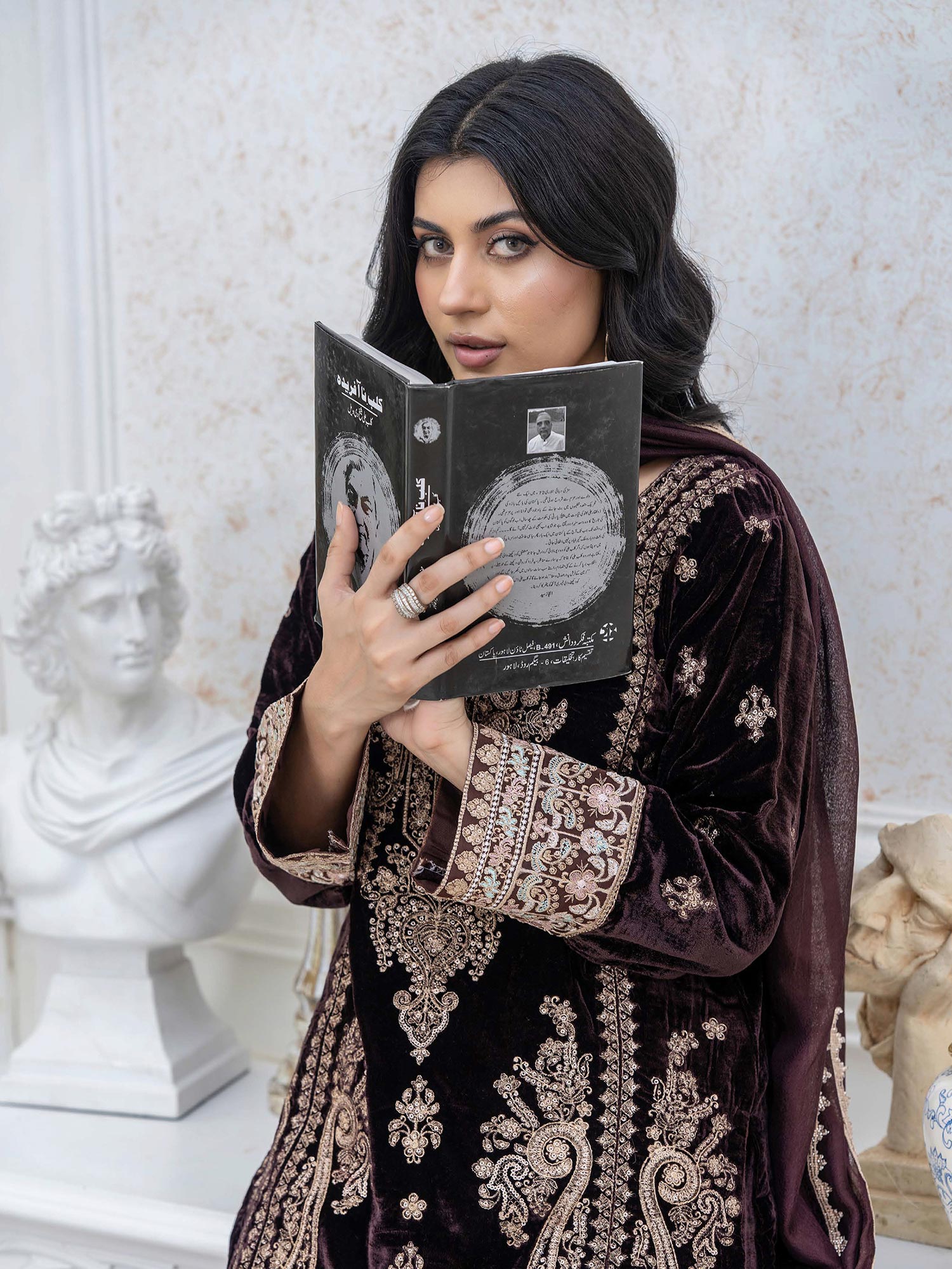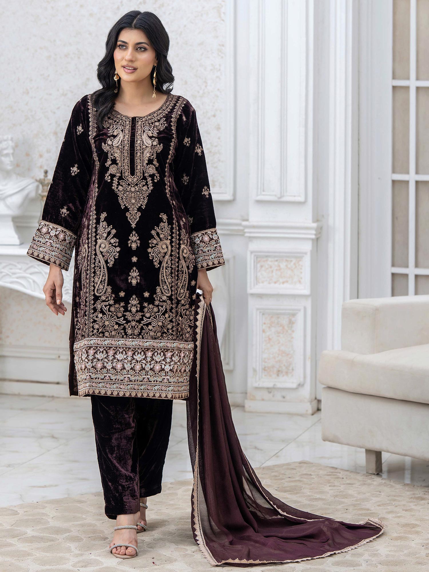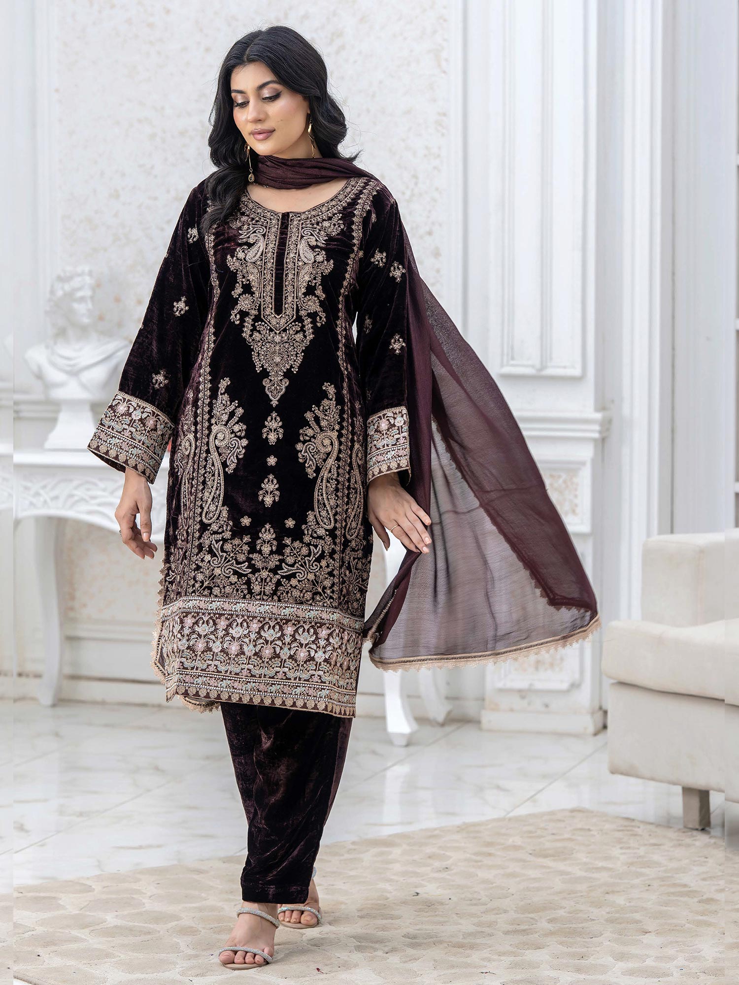 Rangz Lux Velvet Embroidered 3-Piece Suit - Brown