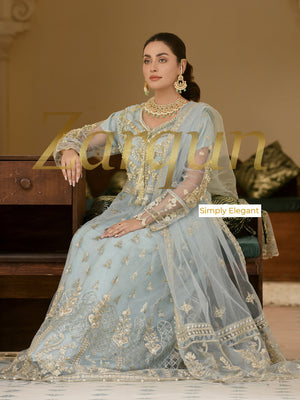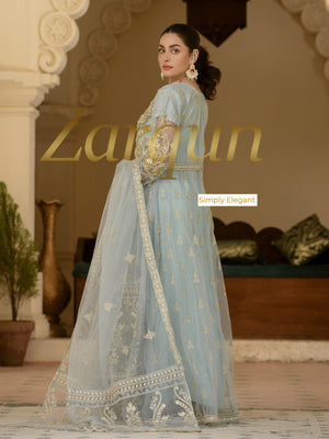 Zarqun Ice Blue Fancy Embroidered Net 3-Piece Maxi Suit