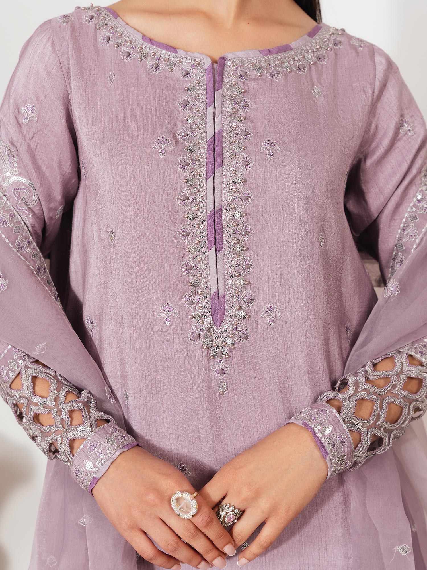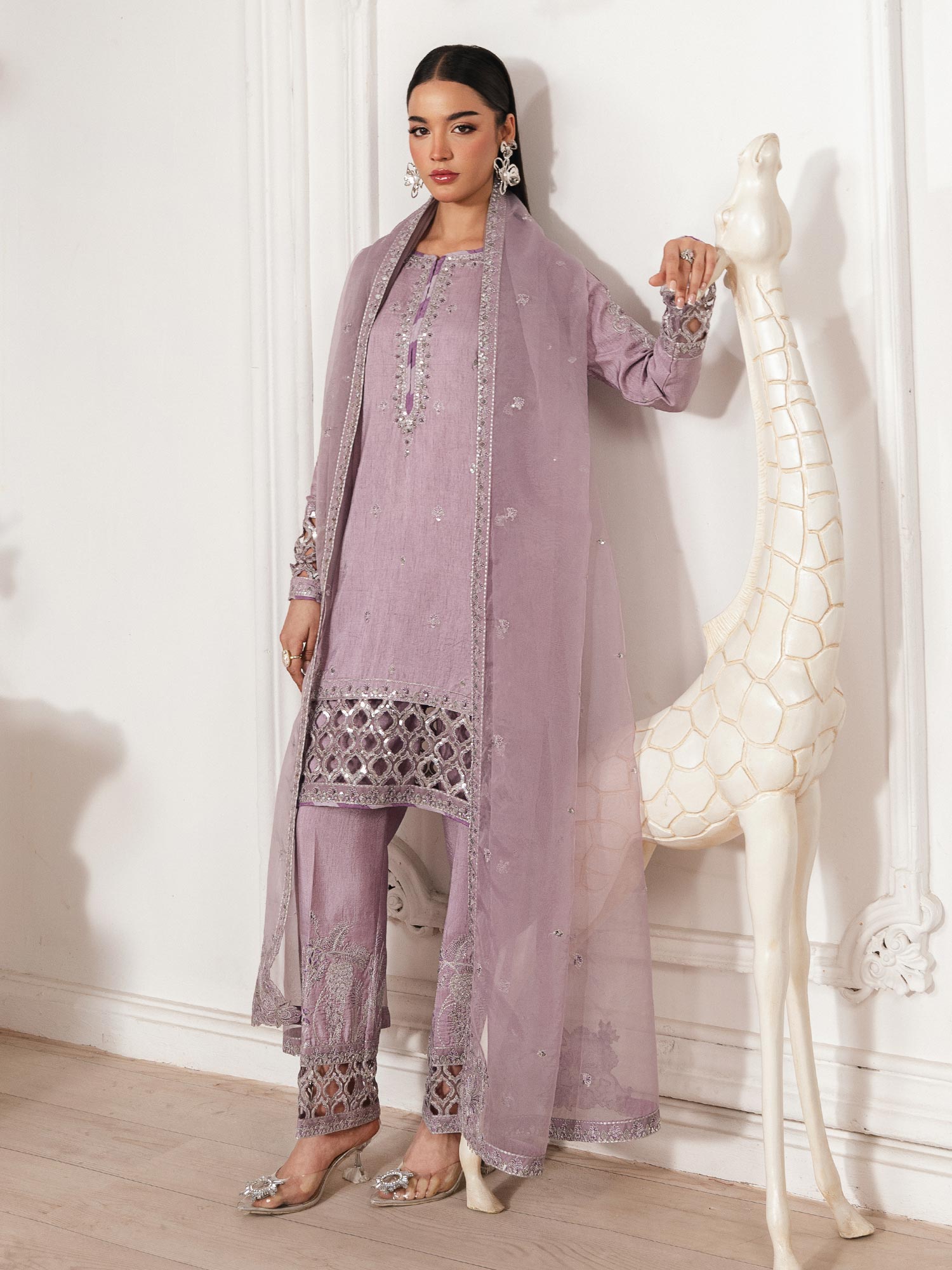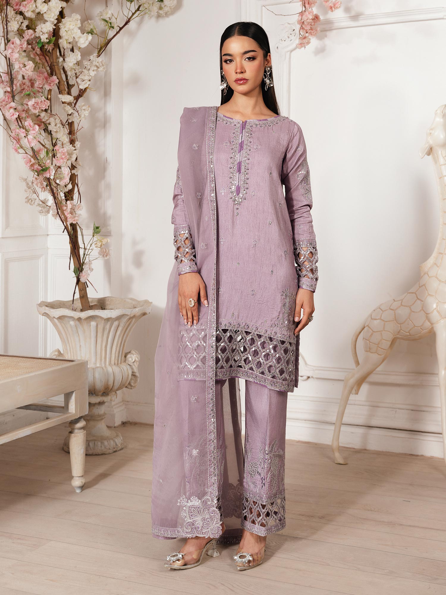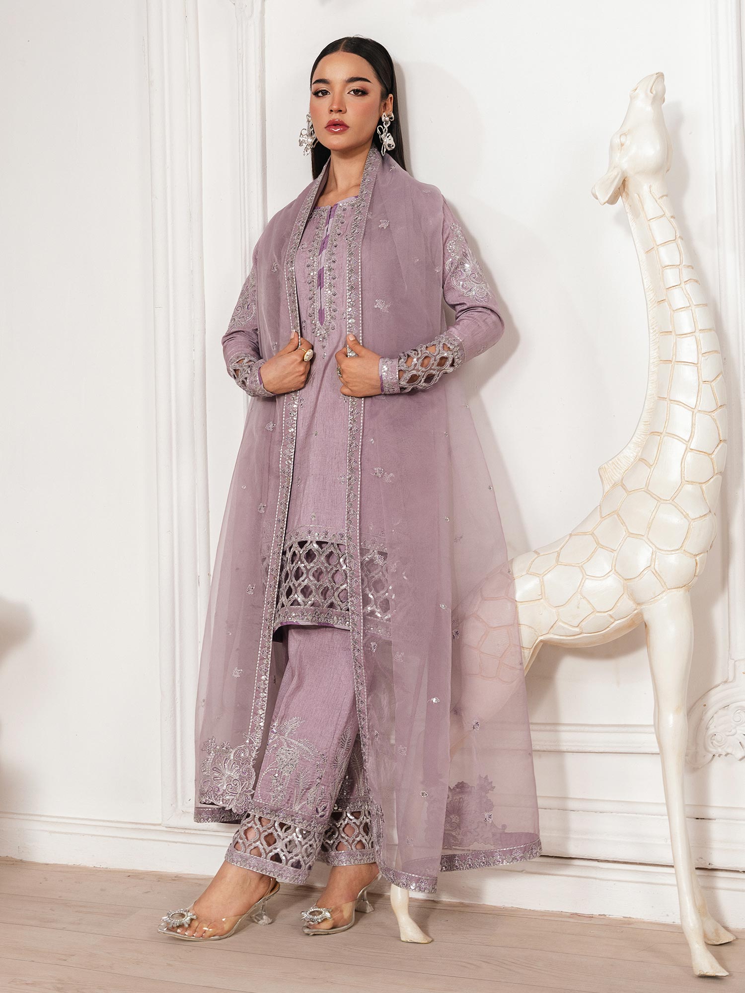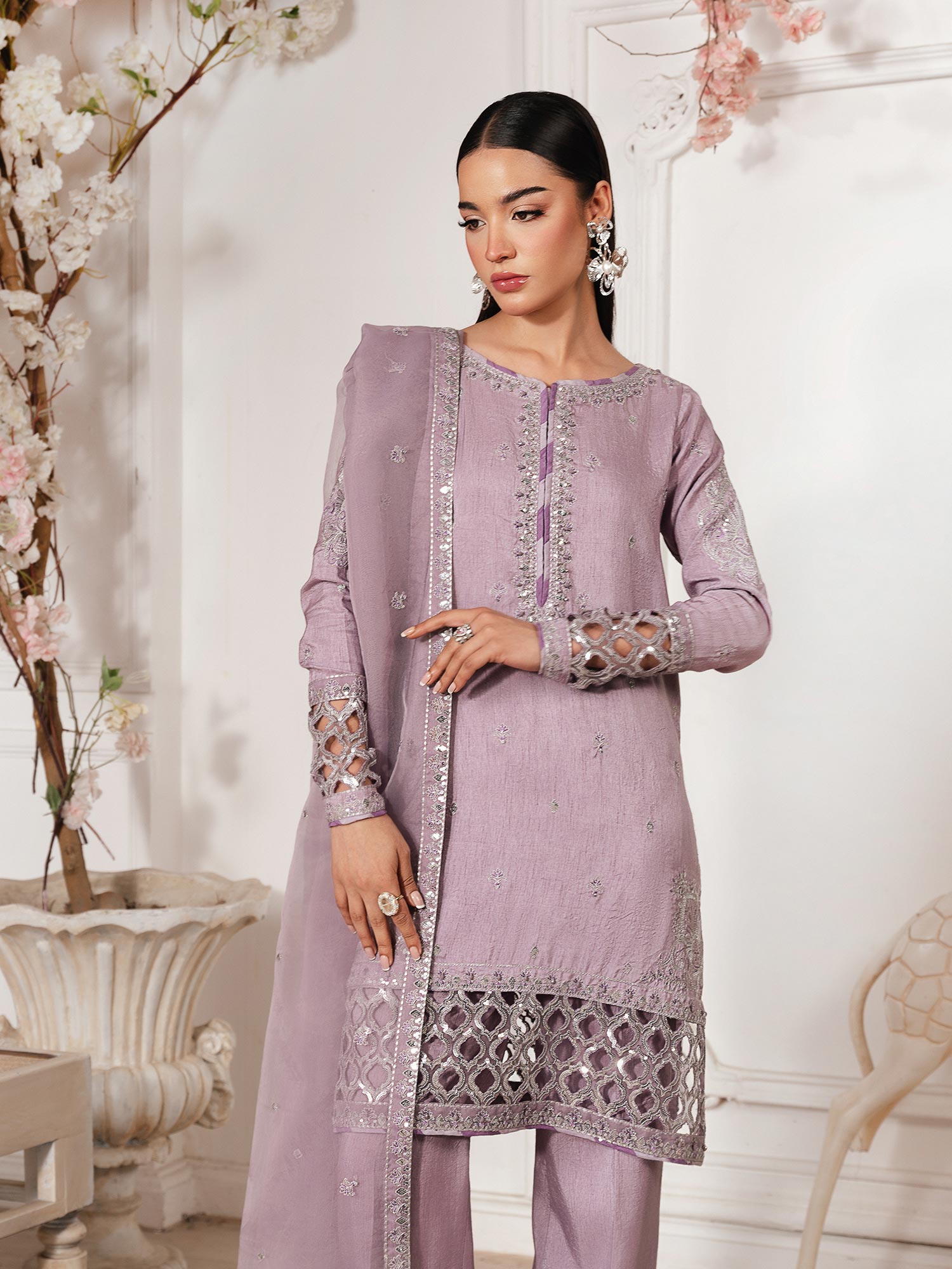 - Long Shirt with light flarred pants paired with organza duppata, an outfit completes the look with heavy embroidery and embellishment.