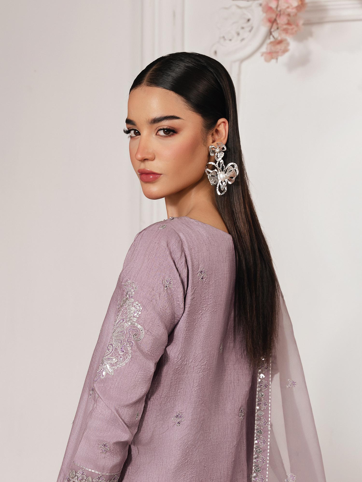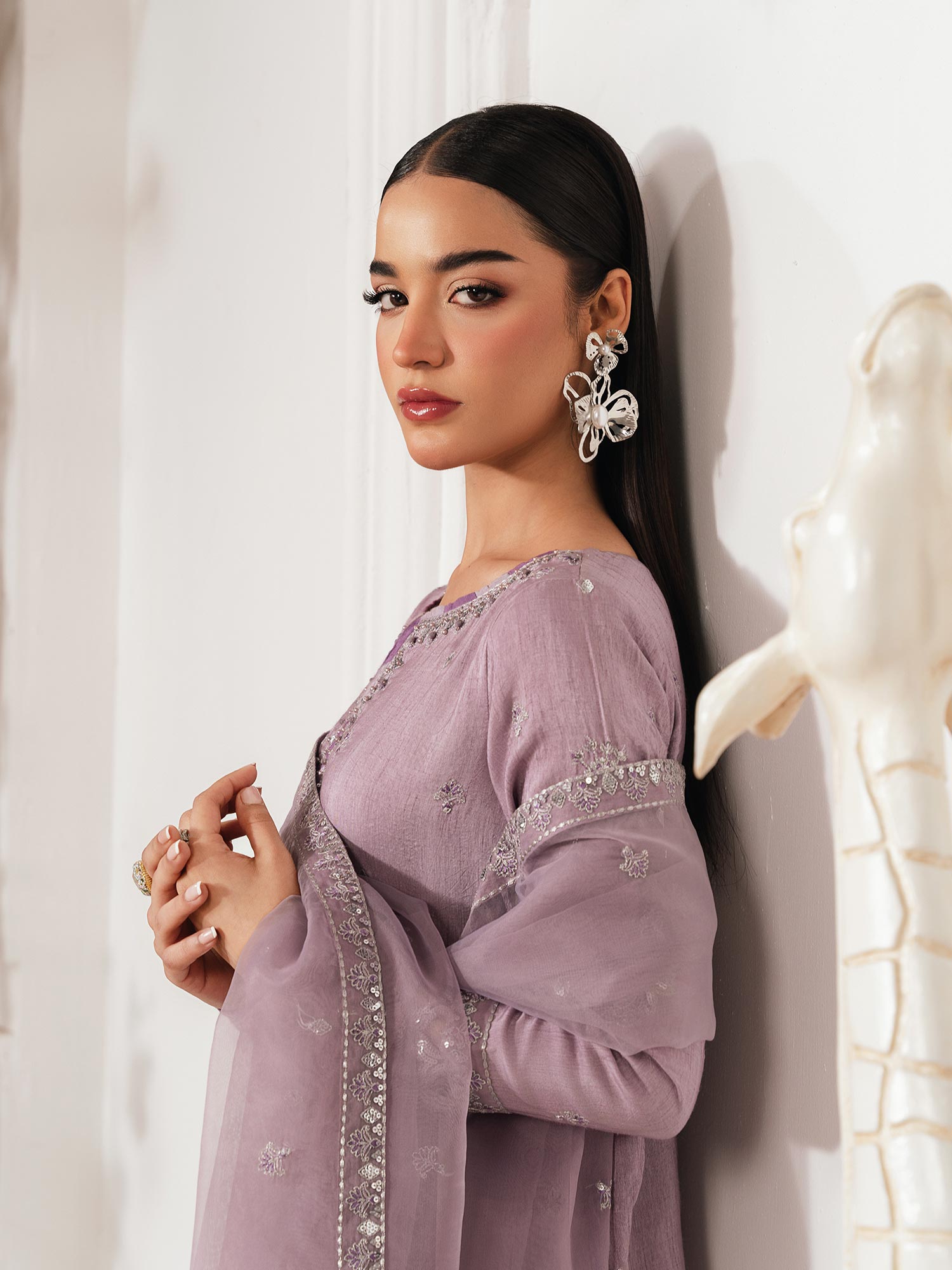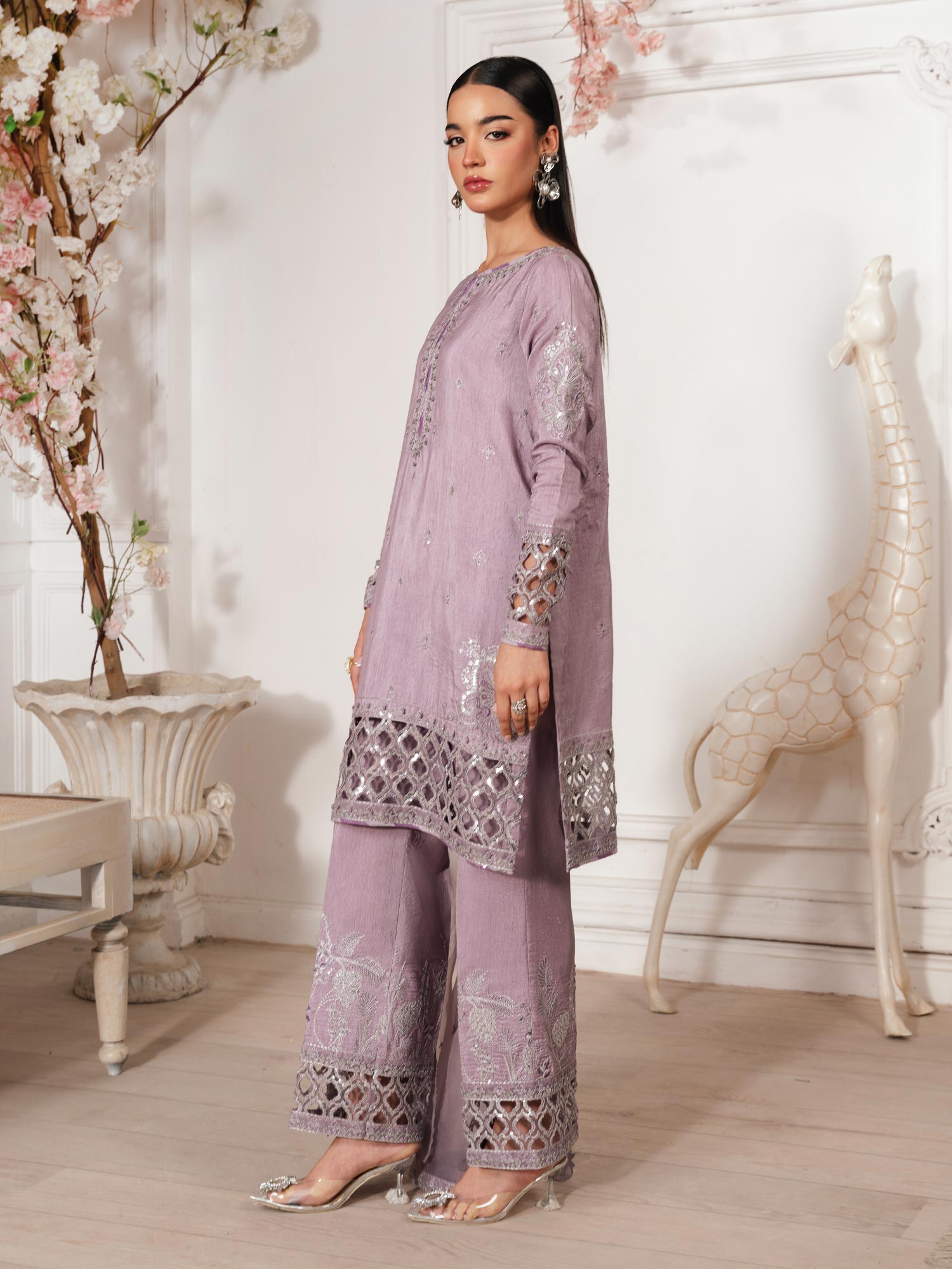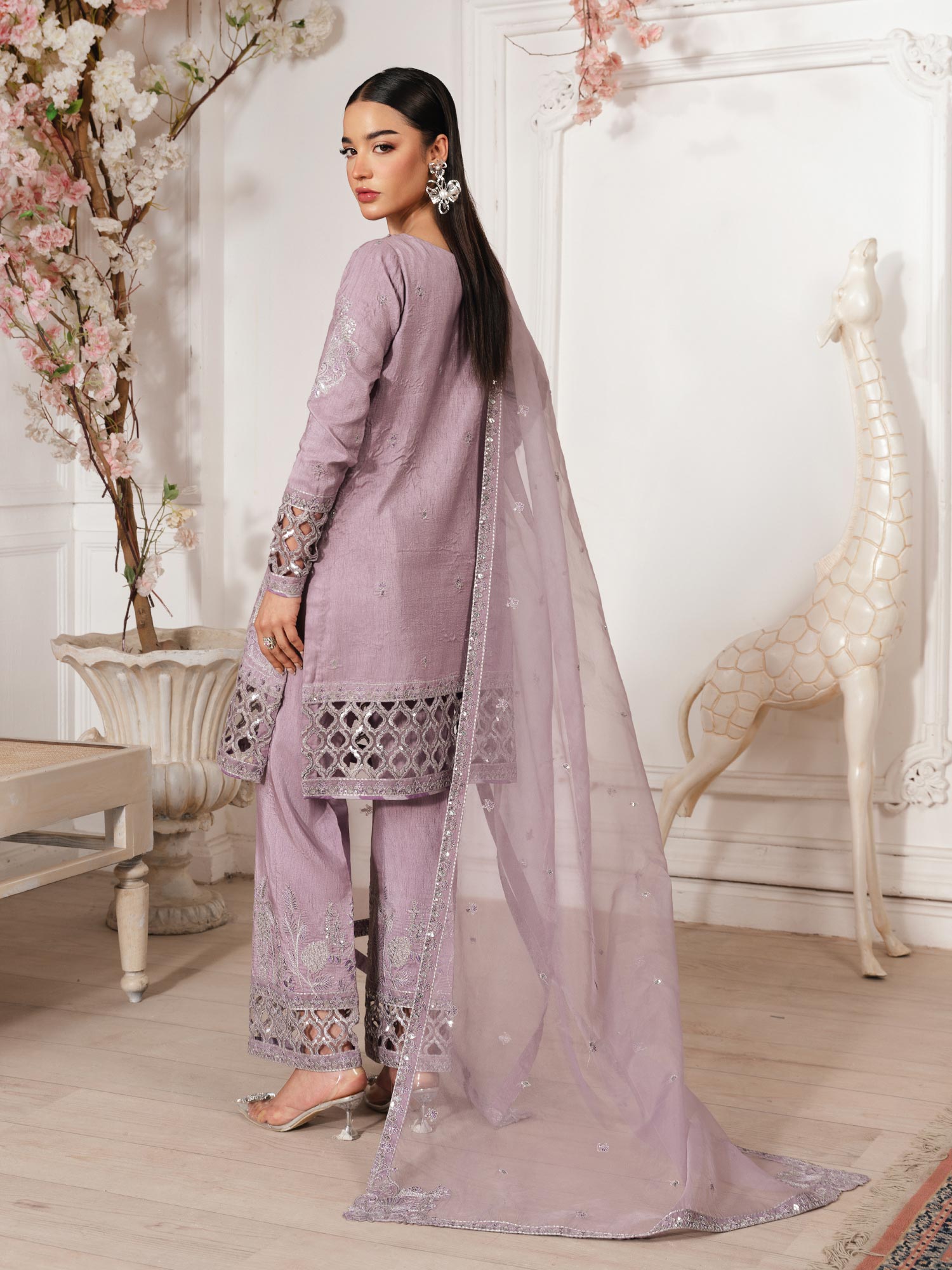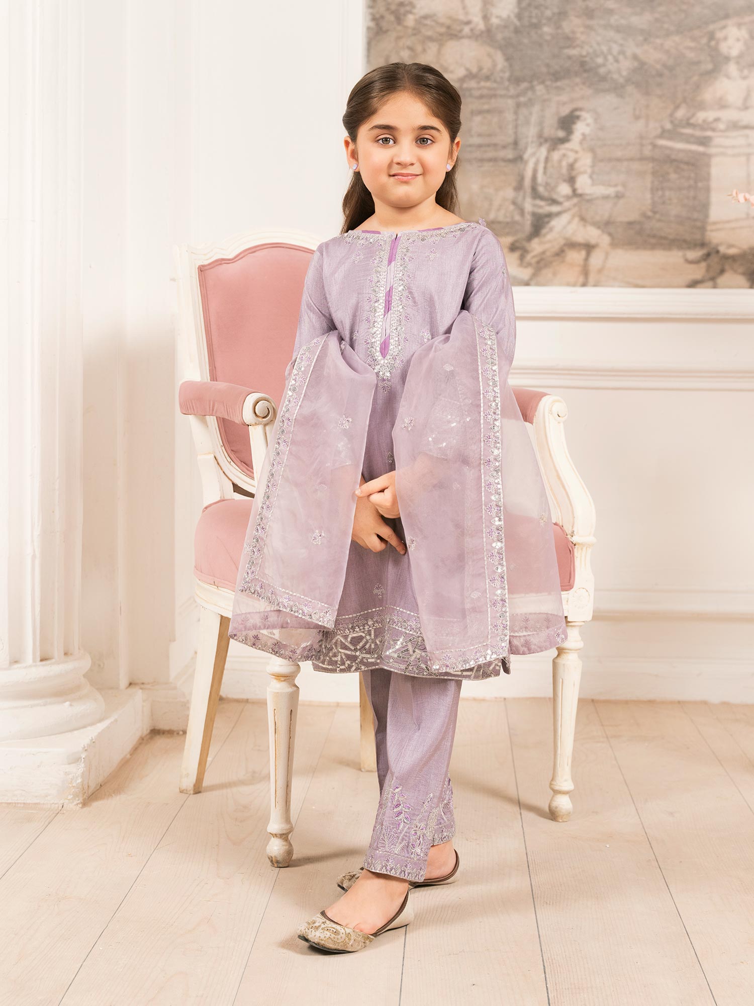 - Long Shirt with light flarred pants paired with organza duppata, an outfit completes the look with heavy embroidery and embellishment.